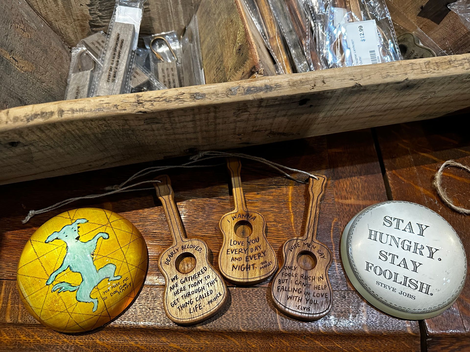 A display of hats and baskets in a store with a picture of santa on the wall.